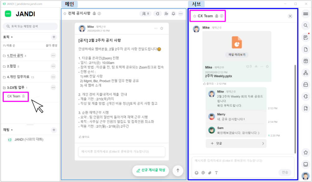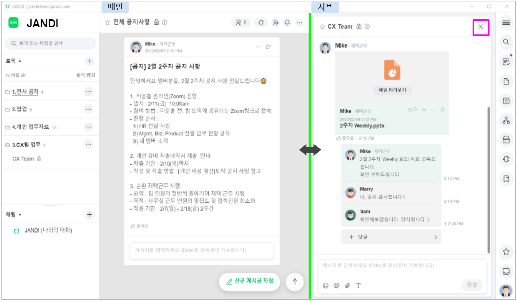 - 서브 화면의 토픽/채팅방을 변경하고 싶다면, Ctrl (Mac: cmd) 누른 상태에서 다시 토픽/채팅방 명을 클릭해주세요.