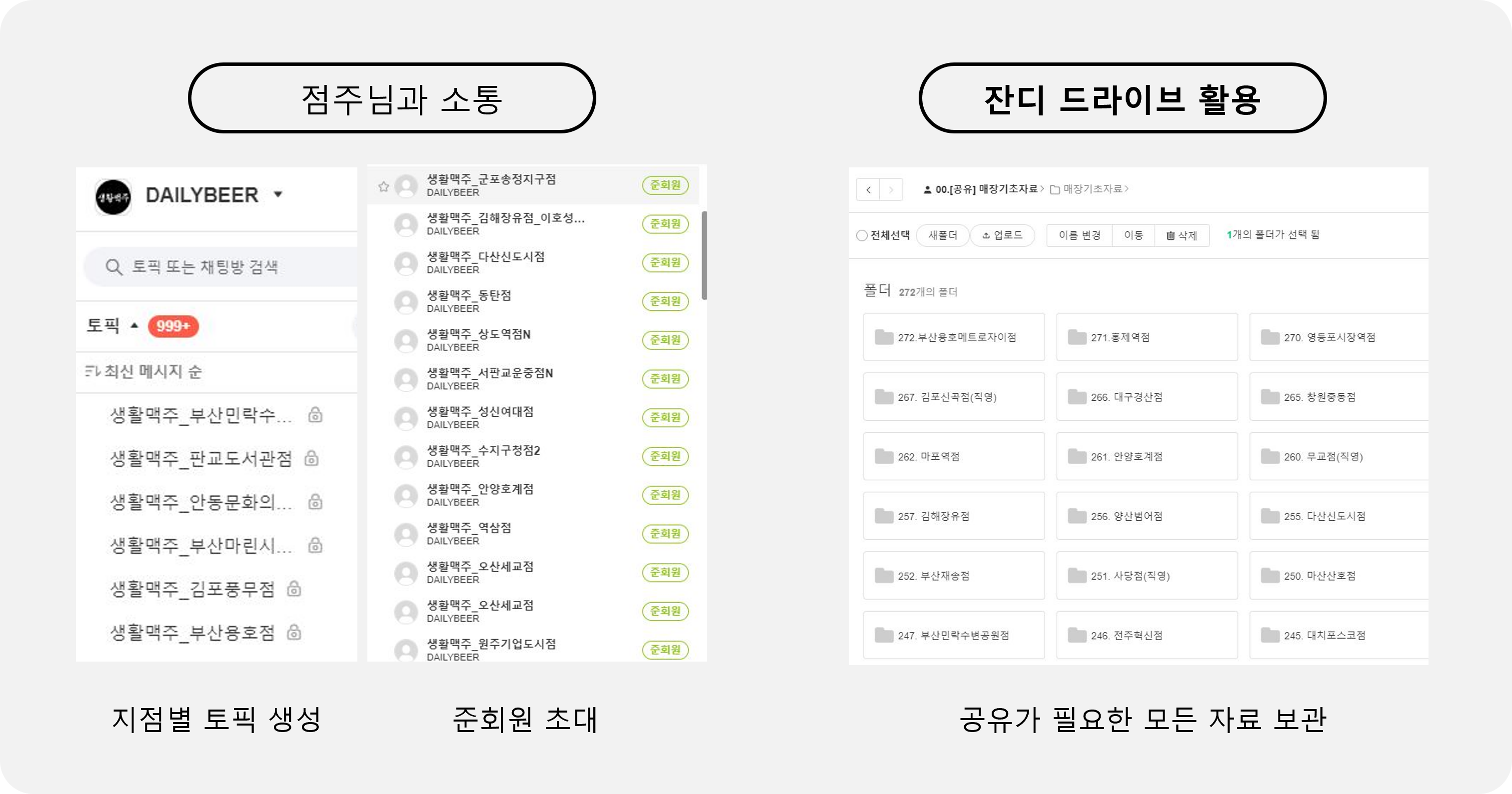 3. 생활맥주와 관련된 모든 이해관계자들이 하나의 소통 툴에서 주제 별로 업무를 논의하면서 효율적인 업무 체계가 정착됐습니다.