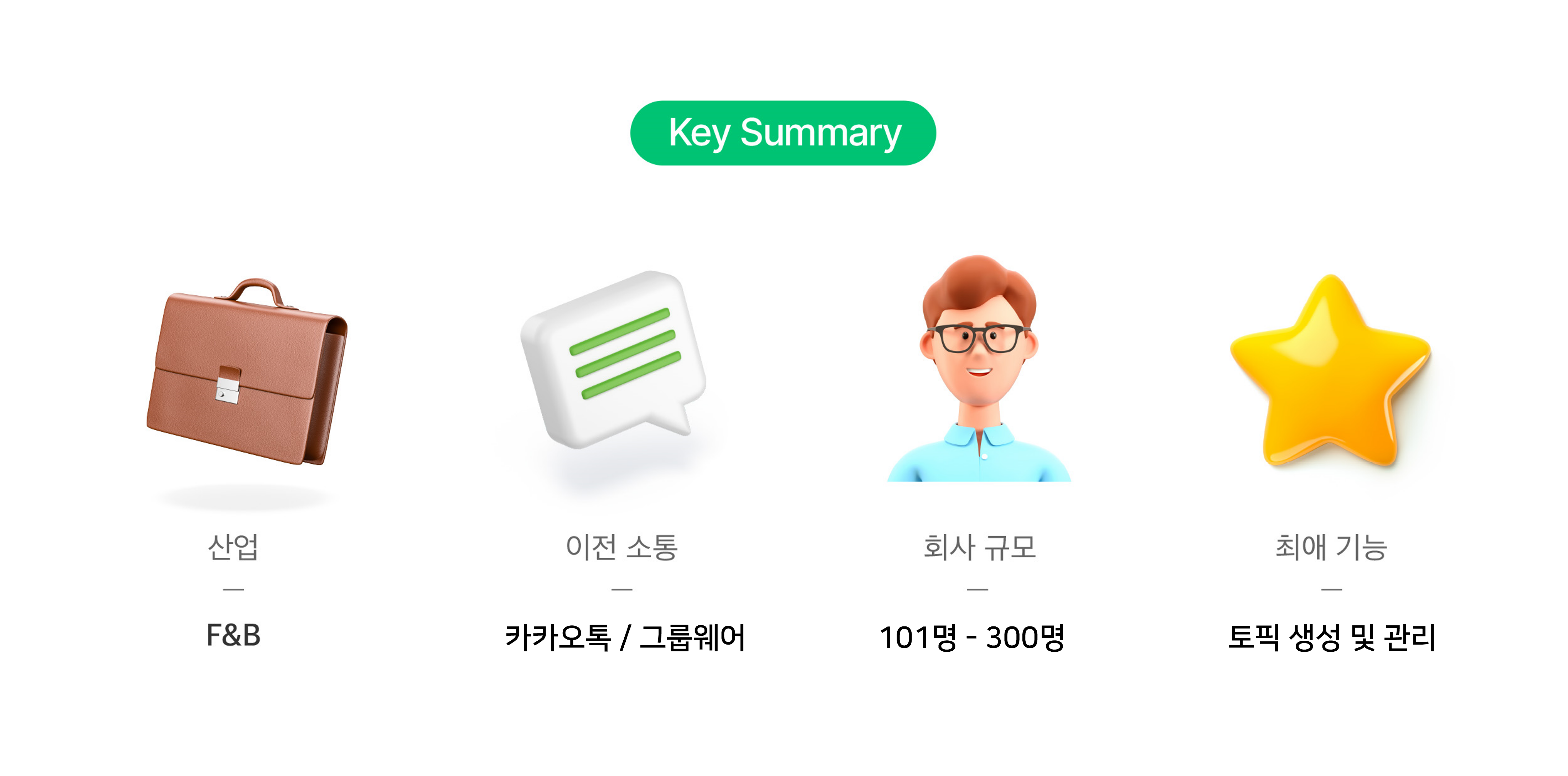업무 전용 메신저로 공과 사의 구분이 필요했으며 본사 직원들과 점주 님들 간의 소통 채널을 일원화 시키면 업무 효율성이 높아질 것이라 판단하여 여러 협업툴을 고민하던 중 F&B 사업자에게 필요한 기능들을 가장 잘 갖추고 있는 ‘잔디’를 선택했습니다.