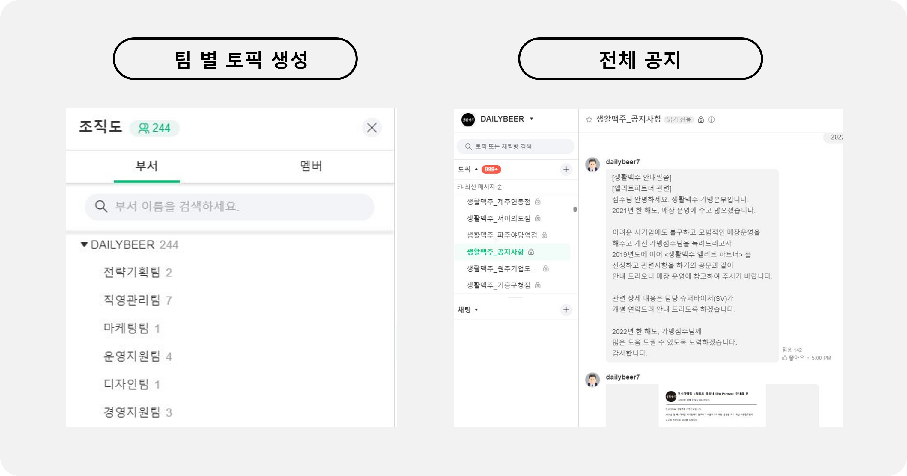 - 팀별, 업무별, 매장별, 메뉴별로 토픽을 나눠 업무를 진행할 수 있습니다.