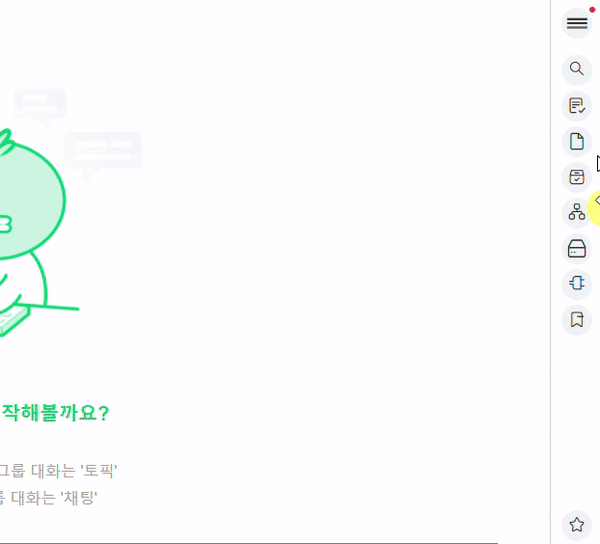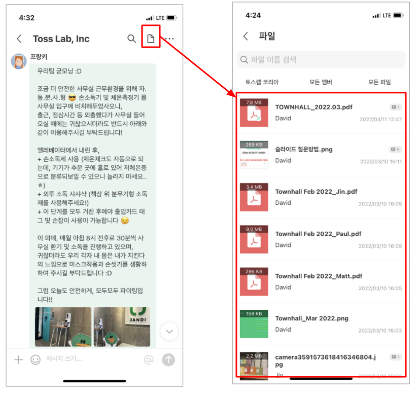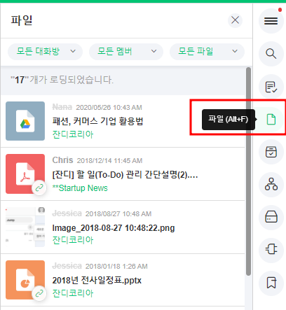 - 우측 상단 [파일] 아이콘을 클릭하면 해당 토픽방에서 주고받은 파일을 확인할 수 있어요!