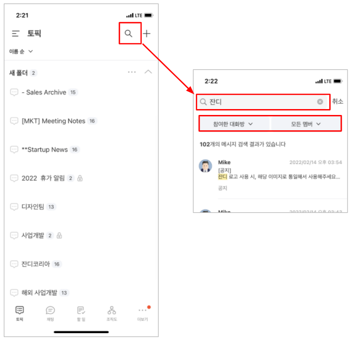 - 작성한 대화방과 작성한 멤버로 필터링하여 검색 가능해요!