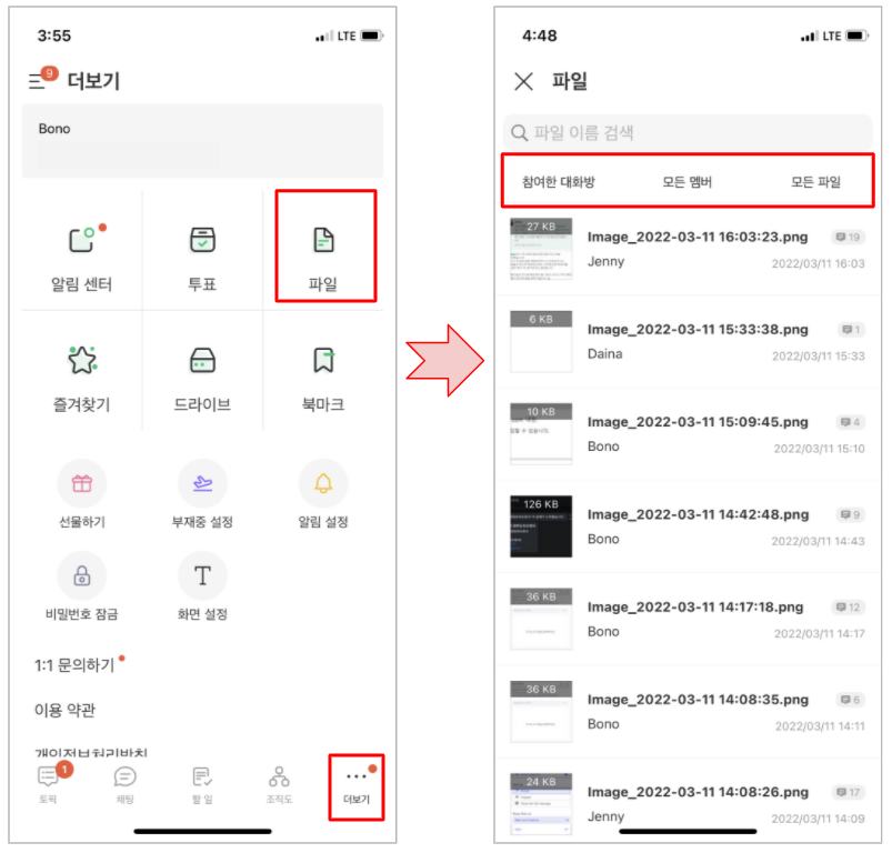 1-2. 앱 하단 [더보기] -[파일]로 확인해주세요
