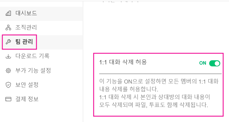 단, 1:1 대화 삭제는 Enterprise 플랜만 제공하고 있으며, 1:1 채팅을 전체 삭제하는 기능을 팀 관리자 관리자 메뉴에서 설정할 수 있습니다.