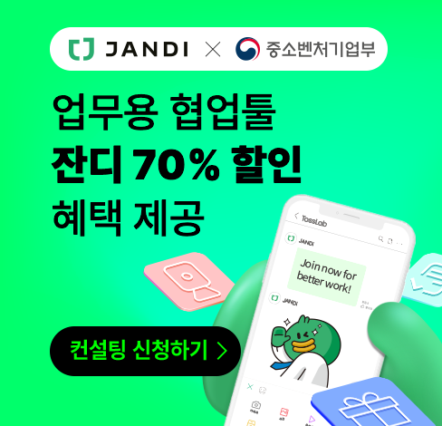 또한, 잔디는 메신저 기반 협업툴로 구성원과 실시간 소통하면서 업무를 빠르고 효율적으로 진행할 수 있습니다. 각 업무 주제별로 구성된 토픽방에서는 관련 문서 및 대화가 영구 보존되어 업무 히스토리 파악이 용이하고 개인용 메신저 활용으로 인한 문서 및 정보 유출 위험을 줄일 수 있습니다. 50인 이상 사업장의 경우 별도로 문의주시면 상담을 통해 추가 혜택을 안내드리겠습니다.