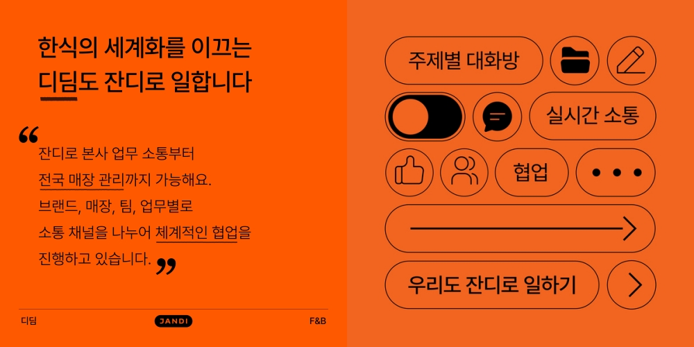 본사 업무 소통부터 전국 매장 관리까지 빠르고 긴밀한 소통이 필요했던 디딤은 수많은 협업툴 중 잔디를 선택했습니다. 본사-직영점-가맹점-공장-해외매장을 아우르는 전방위 사업장의 소통 채널을 잔디로 통합해 기업 경쟁력을 강화하고 있어요.