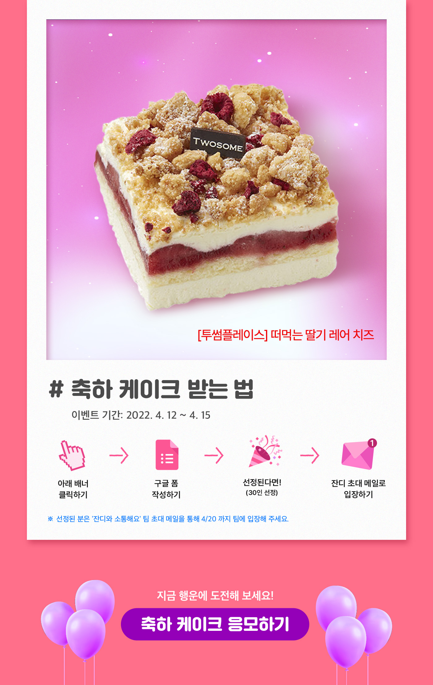 코로나19 확진자 수는 여전히 높지만 그래도 감소하는 분위기로 사회적 거리두기도 완화됐습니다. 봄도 어느덧 성큼 다가와 따뜻한 날씨로 꽃이 만개하였고 기분 좋은 햇살에 좋은 일도 더 행복하게 느껴지는 4월인 것 같습니다. 잔디 일잘러 여러분들의 어떠신가요? 이번 달 행복한 일과 축하할 날 있으신가요? 그렇다면 잔디에 공유📨해주세요. 30인을 선정하여 달콤한 케이크 상품 쿠폰을 잔디 선물하기 서비스를 통해 전달 드리겠습니다.