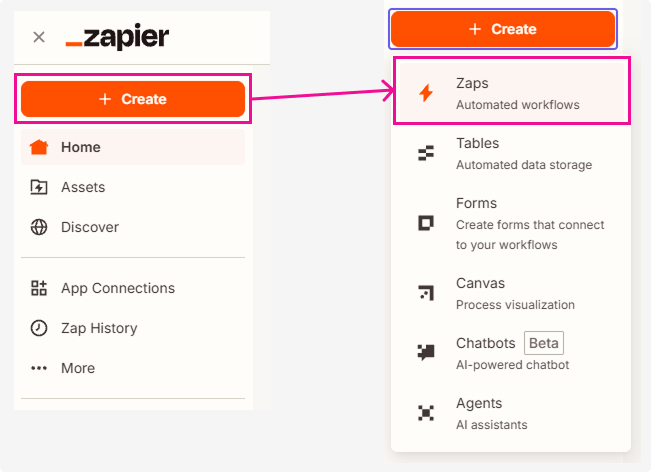 2-1. Zapier 메인 페이지 좌측 상단의 [Creat Zap] 버튼으로 Zap을 생성합니다.