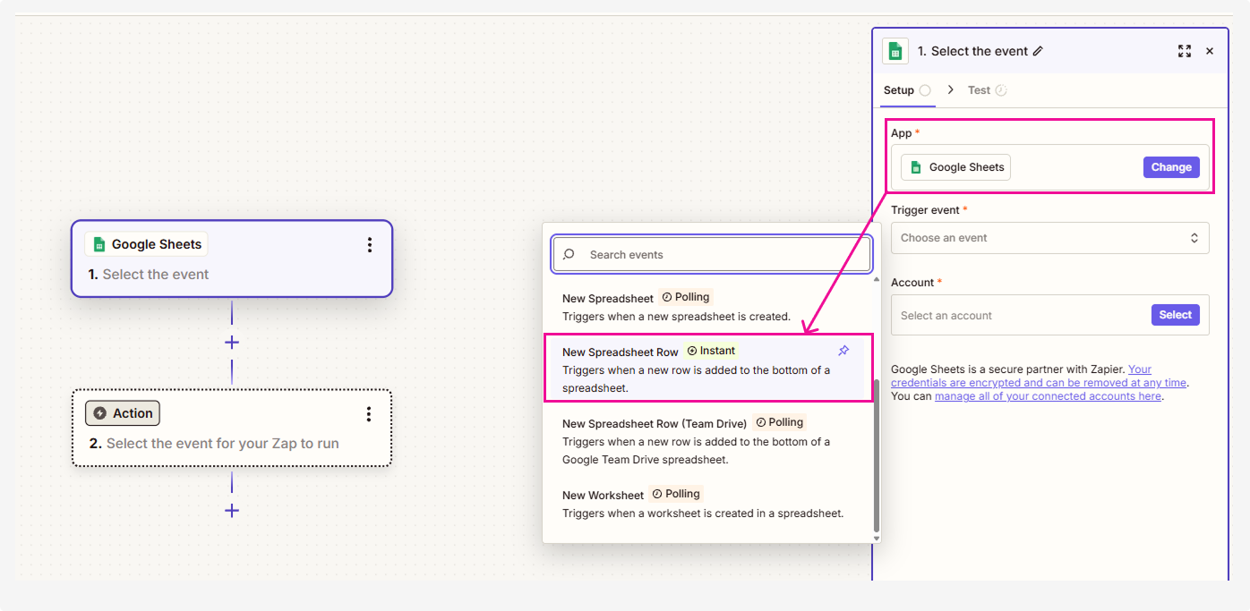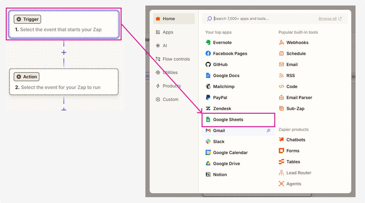 2-2. Zap의 Trigger 항목에서 [Google Sheets]를 선택합니다.