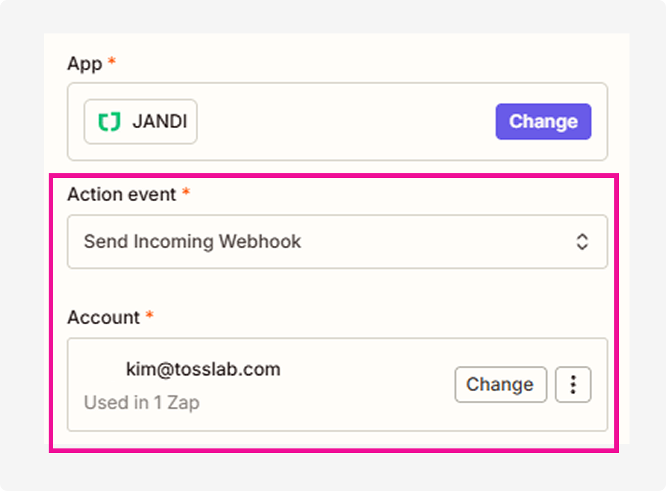 2-8. [Action Event] > [Send Incoming Webhook] / [Account] 에서 [잔디 계정]을 선택해주세요.