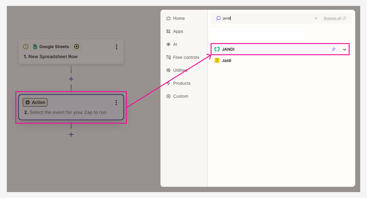 2-7. [Action] > JANDI 앱을 검색한 후, 선택해 주세요.