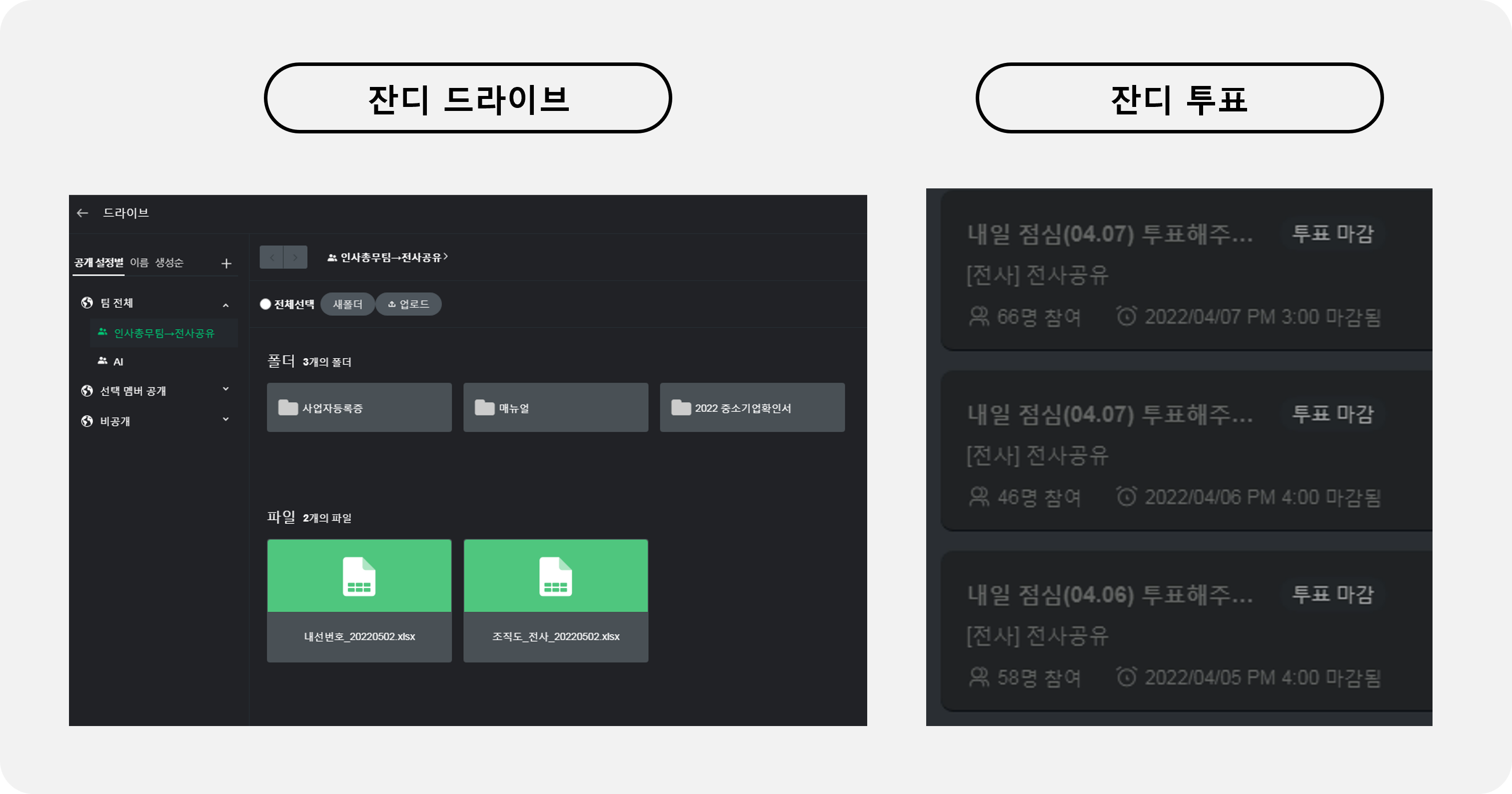 코로나 확진자가 많이 발생했을 때 회사에서 점심 도시락을 매일 제공했어요. 이 때 잔디 투표 기능이 큰 역할을 했어요. 투표를 통해 구성원들이 선호하는 메뉴를 쉽게 공유 가능했고, 빠르게 취합도 가능했어요. 사이트 로그인 정보나 전사 공지가 필요한 사항은 보드뷰를 통해 공유합니다. 공유를 위해 잔디 드라이브 활용도 많이 합니다. 취업 규칙, 사내규정, 양식 등 공통적으로 사용되는 파일들도 잔디 드라이브를 통해 전사에 공유하고 있습니다. 각 부서들도 고용량의 파일을 주고 받을 경우가 많은데 잔디 드라이브를 통해 번거롭지 않게 업무 처리가 가능해졌어요.