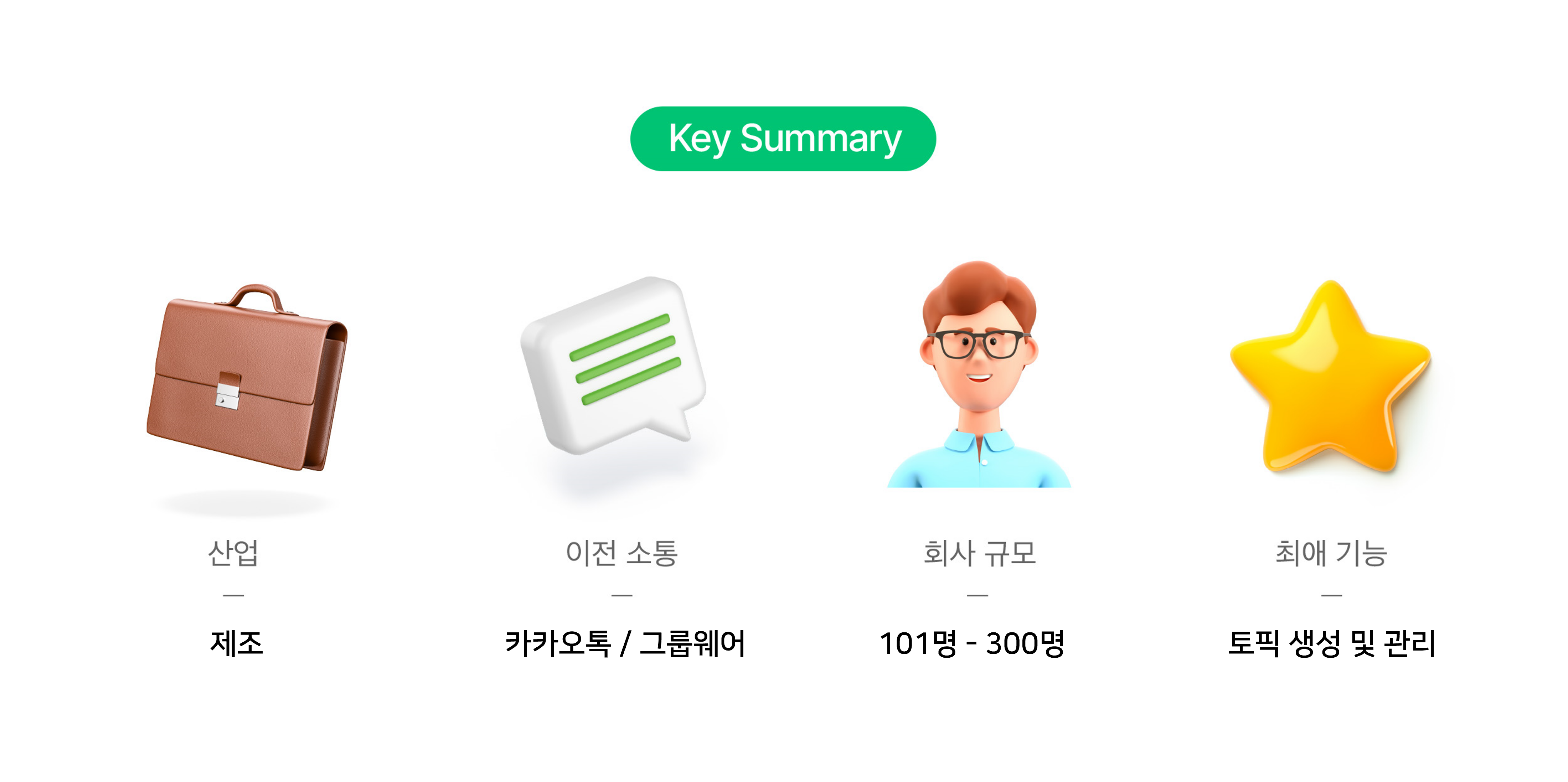 기존에는 외부 업체와 커뮤니케이션을 진행할 때, 카카오톡 등 개인 메신저를 이용하여 소통이 이루어져 있는데 지금은 준회원 기능을 통해 외부 협력사와 커뮤니케이션을 진행하고 있기 때문에 사적인 공간과 공적인 공간을 분리할 수 있습니다. 그리고, 준회원 기능을 통해 전국에 있는 판매 매장 직원들을 초대하여 주제별 토픽(공지안내토픽, 재고현황 공유 토픽 등) 으로 묶어 좀 더 수월한 의사소통이 이루어지고 있습니다.