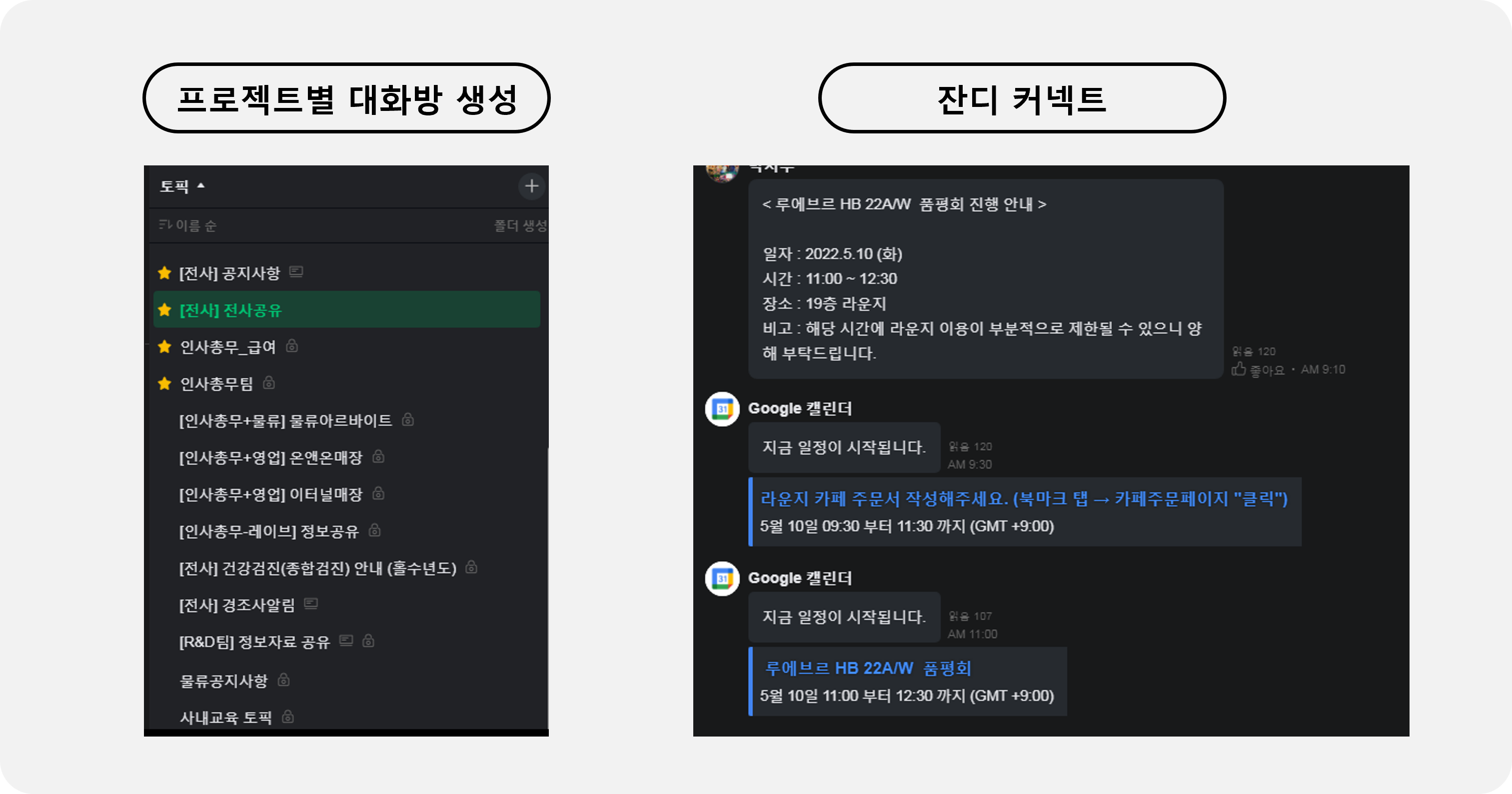 - 주제별 대화방으로 지점별·프로젝트별로 업무 공간을 구분합니다.
