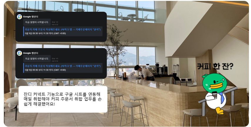 잔디를 활용한 사내 문화 중 가장 소개해 드리고 싶은 것은 잔디를 통해 커피 주문서를 취합하는 것입니다. 보끄레머천다이징 구성원이라면 점심시간 후에 원하는 커피를 카페라운지에서 받을수 있는데요, 이를 위해 사전에 원하는 커피 주문을 받아 커피를 기다리는 시간을 줄이고자 해요. 그러다 보니 매일 구성원들의 주문을 취합해야 하는 번거로움이 있는데 잔디 커넥트 기능을 통해 매일 동일한 시간에 구글 스프레드시트 알림을 통해 주문서를 받고 쉽게 취합하여 바리스타가 시간에 맞춰 커피를 준비해주십니다.