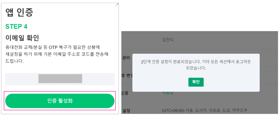 - 인증 활성화 버튼 클릭 후 2단계 인증 설정이 완료된 안내 팝업을 확인할 수 있습니다.