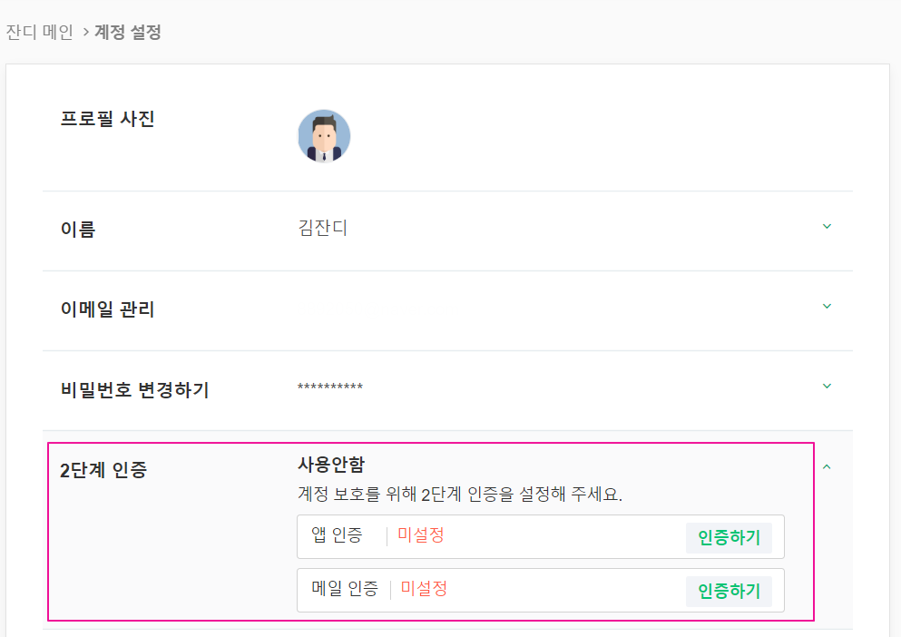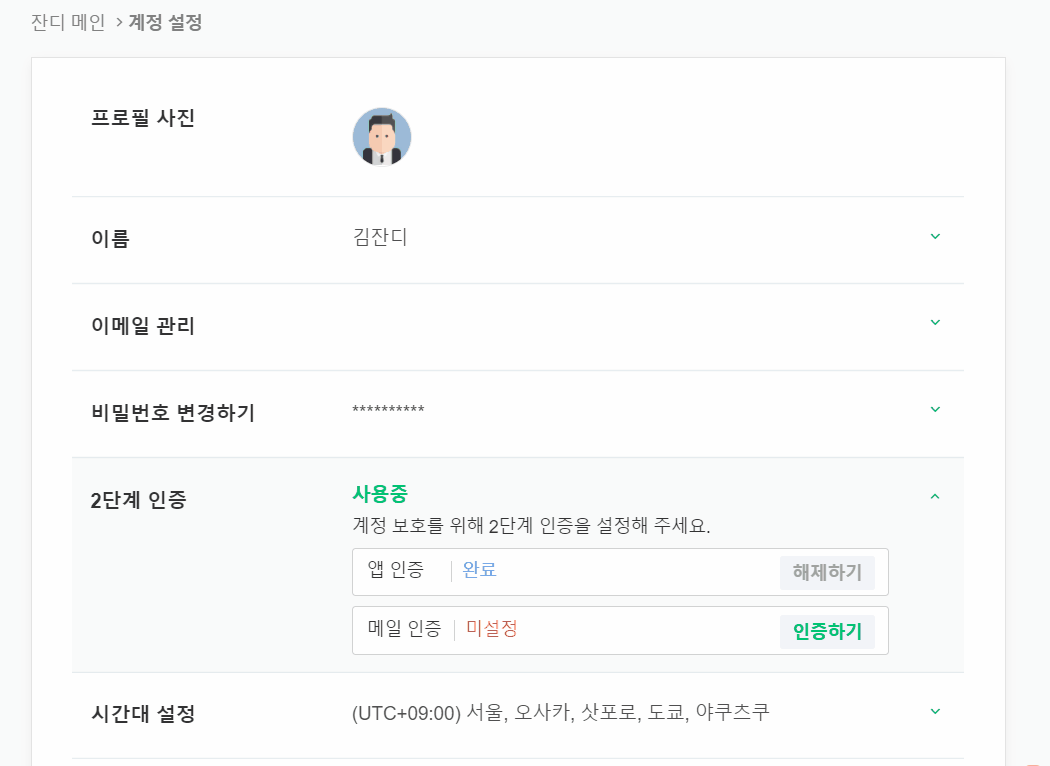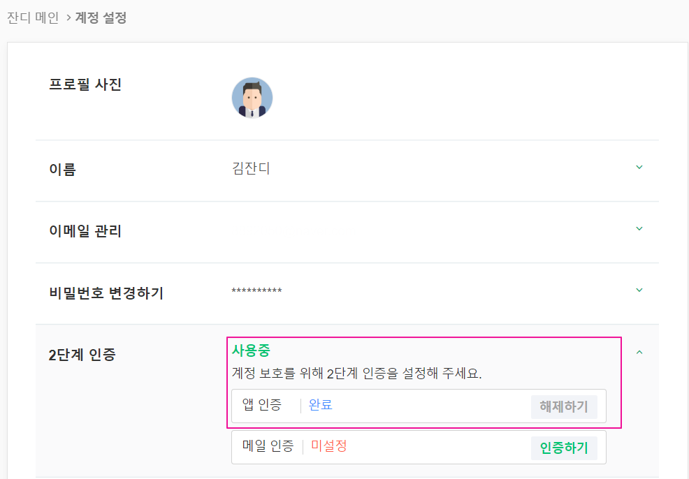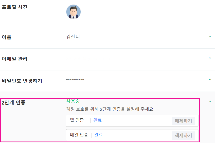 - 계정 설정에서 2단계 인증이 완료된 걸 확인하실 수 있습니다.