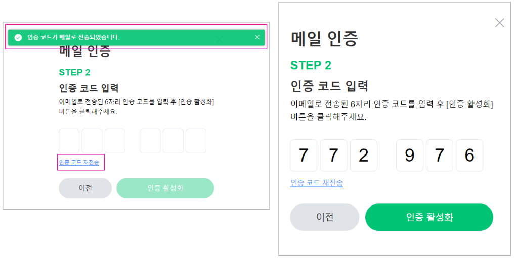 - 인증코드는 발송 후 5분까지 유효하고, 인증 시간 내에 입력을 하지 못하면 [인증 코드 재전송] 버튼을 클릭하면 새로운 인증번호가 메일로 발송됩니다.
