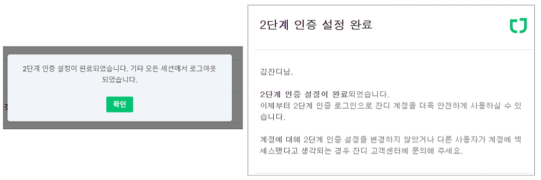 - 메일로 받은 인증코드 입력 > 인증 활성화 버튼 클릭 후 2단계 인증 설정이 완료된 안내 팝업과 함께 이메일을 통해서도 인증 설정 완료를 확인할 수 있습니다.
