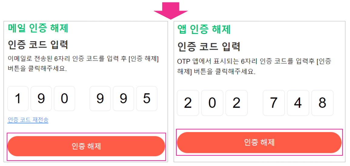 - 앱 인증 해제하기 : 비밀번호 확인 > OTP 앱 6자리 인증코드 입력 > 인증 해제 버튼을 클릭합니다.