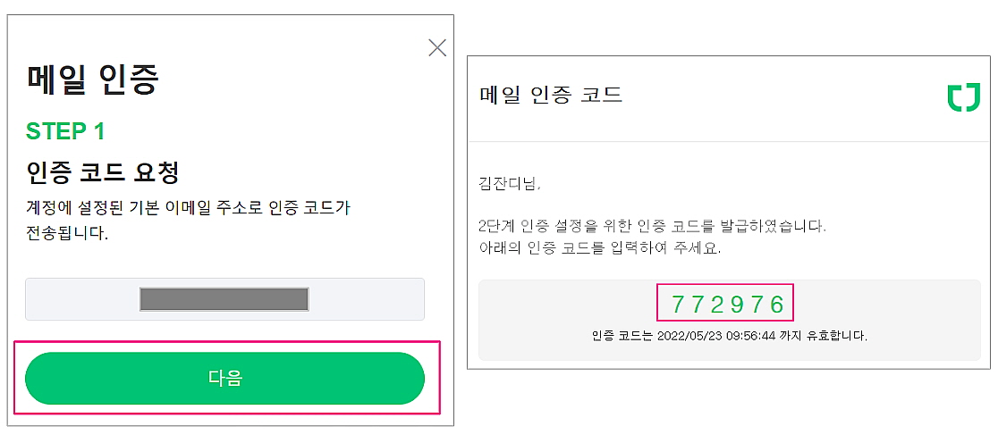 - 2단계 인증 > 메일 인증 > 인증하기 버튼을 클릭합니다.