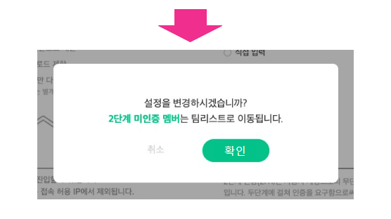 - 2단계 인증 ON을 하게 되면 팀 내에서 2단계 미인증 멤버는 팀에서 자동으로 나가게 됩니다.