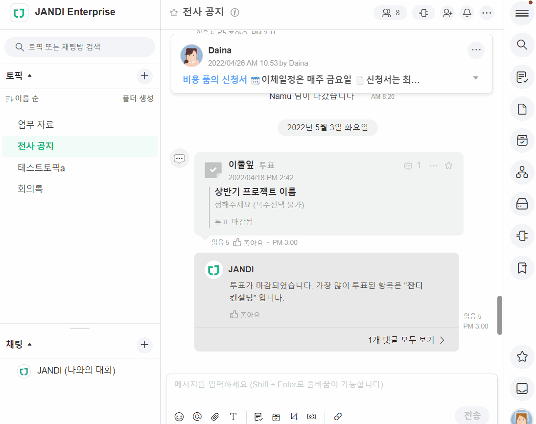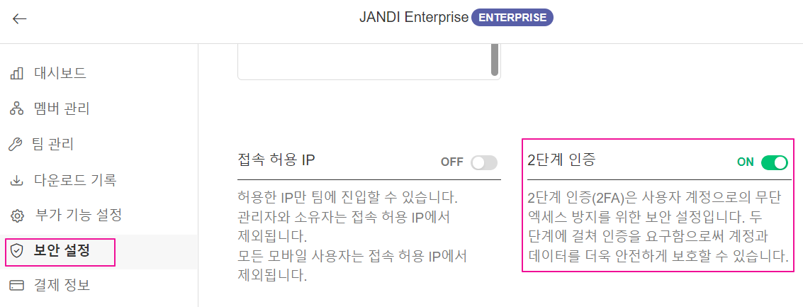팀 보안을 강화하기 위해 팀 멤버에게 JANDI 로그인할 때 2FA (2단계 인증)를 사용하도록 설정할 수 있습니다.