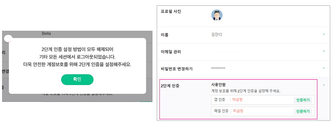 - 2단계 인증 설정은 보안 기능으로, 2FA를 설정한 디바이스 외에 다른 모든 기기에서는 로그아웃이 됩니다.