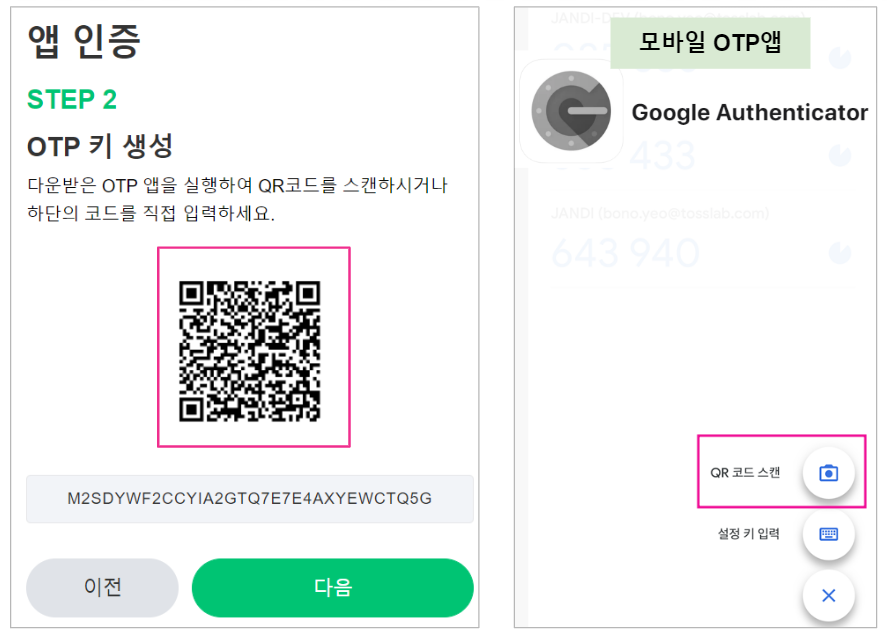 ✔️TIP : WEB에서 인증을 할 때는 코드 입력보단 QR코드 스캔이 간편합니다 😄