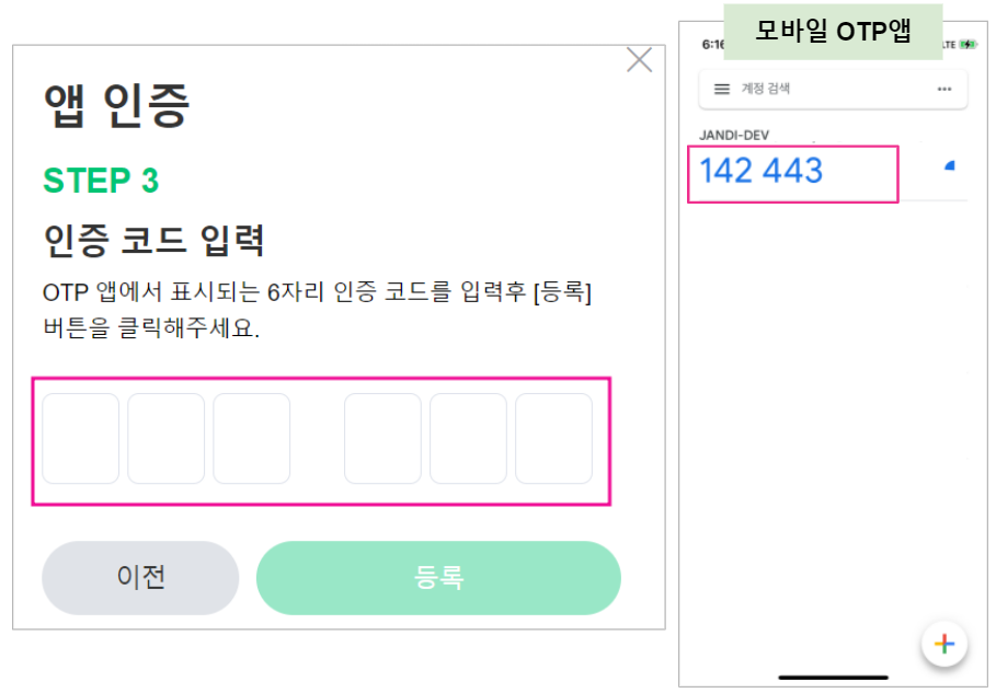 - OTP 앱에서 표시되는 6자리 인증 코드를 입력합니다.