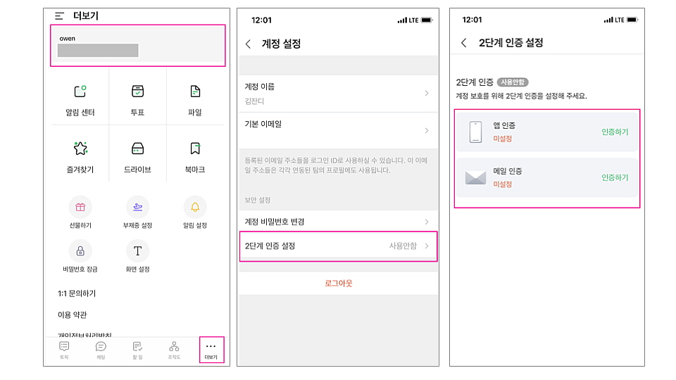 - 앱 하단 더 보기 > 계정 클릭 > 2단계 인증 설정 > 앱 인증 or 메일 인증 선택 후 PC와 동일하게 인증 설정이 가능합니다.