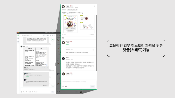 익숙한 메신저 기반 협업툴인 잔디는 모든 멤버가 빠르게 적응했고 도입 후 업무 효율도 상당히 높아졌습니다. 논의가 필요한 사항은 메시지에 대한 댓글과 대댓글로 의견을 나누고 피드백을 진행하고 있는데요. 업무 내용을 다시 찾아볼 때도 히스토리가 한 번에 묶여있어서 업무를 파악하기 쉽습니다. 잔디는 용량이 큰 영상 파일도 무리 없이 전달할 수 있어요. 여러 파일을 한 번에 전송 가능하고 다운로드도 편리합니다.