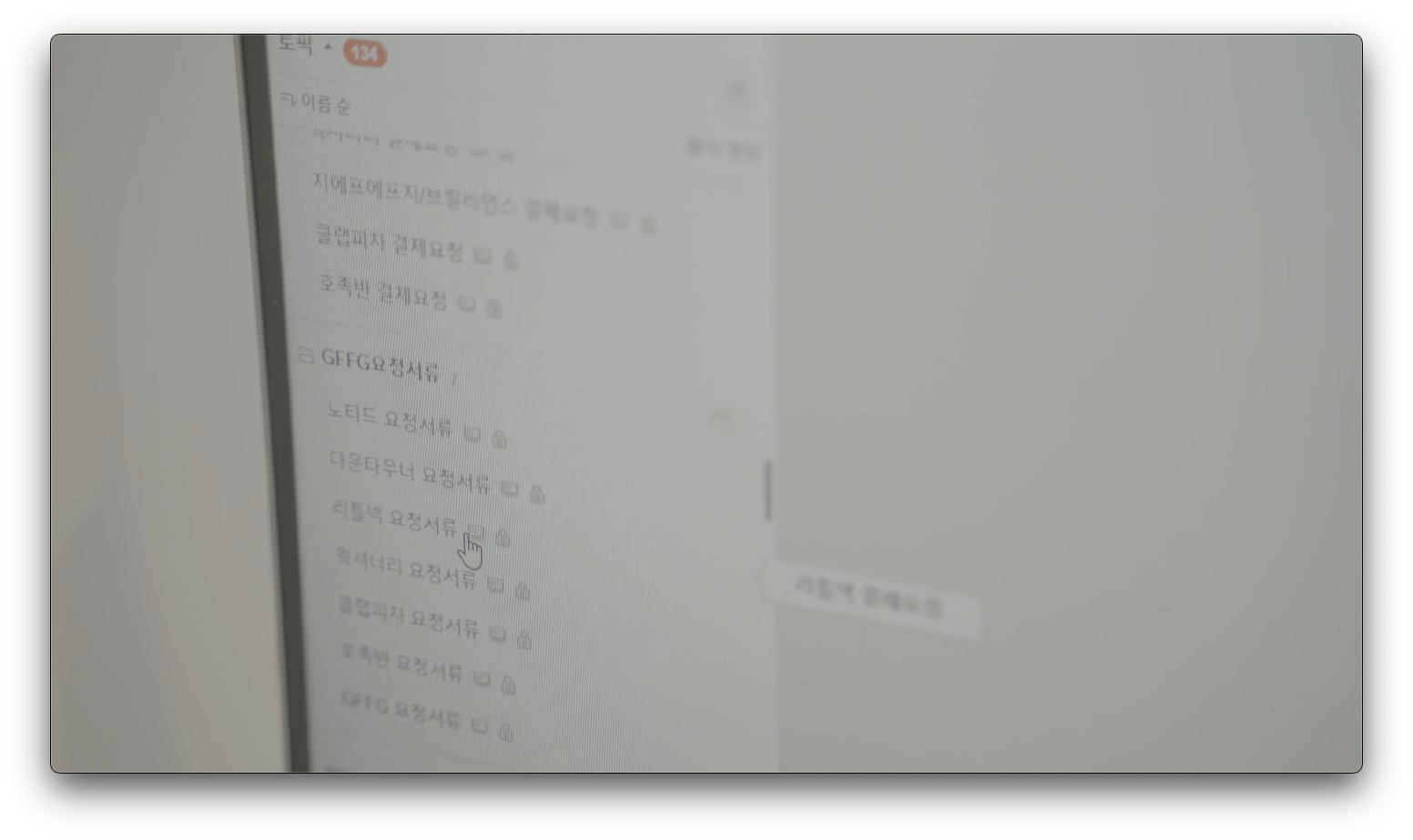 카카오톡은 같은 브랜드 혹은 같은 업무 성격을 가진 대화방을 폴더로 정리할 수 없었는데, 잔디는 폴더로 유관 대화방을 묶고 폴더의 순서도 조정할 수 있어서 업무 우선순위에 맞게 잔디를 구성할 수 있어요. 특히 업무에 관련된 멤버만 참여하는 토픽을 자유롭게 구성할 수 있어 무분별한 카카오톡 메시지에 전 멤버가 노출되는 문제도 해결됐습니다. 실수로 토픽을 나갔더라도 내용이나 공유했던 파일이 사라지지 않아서 안심하고 일할 수 있어요.