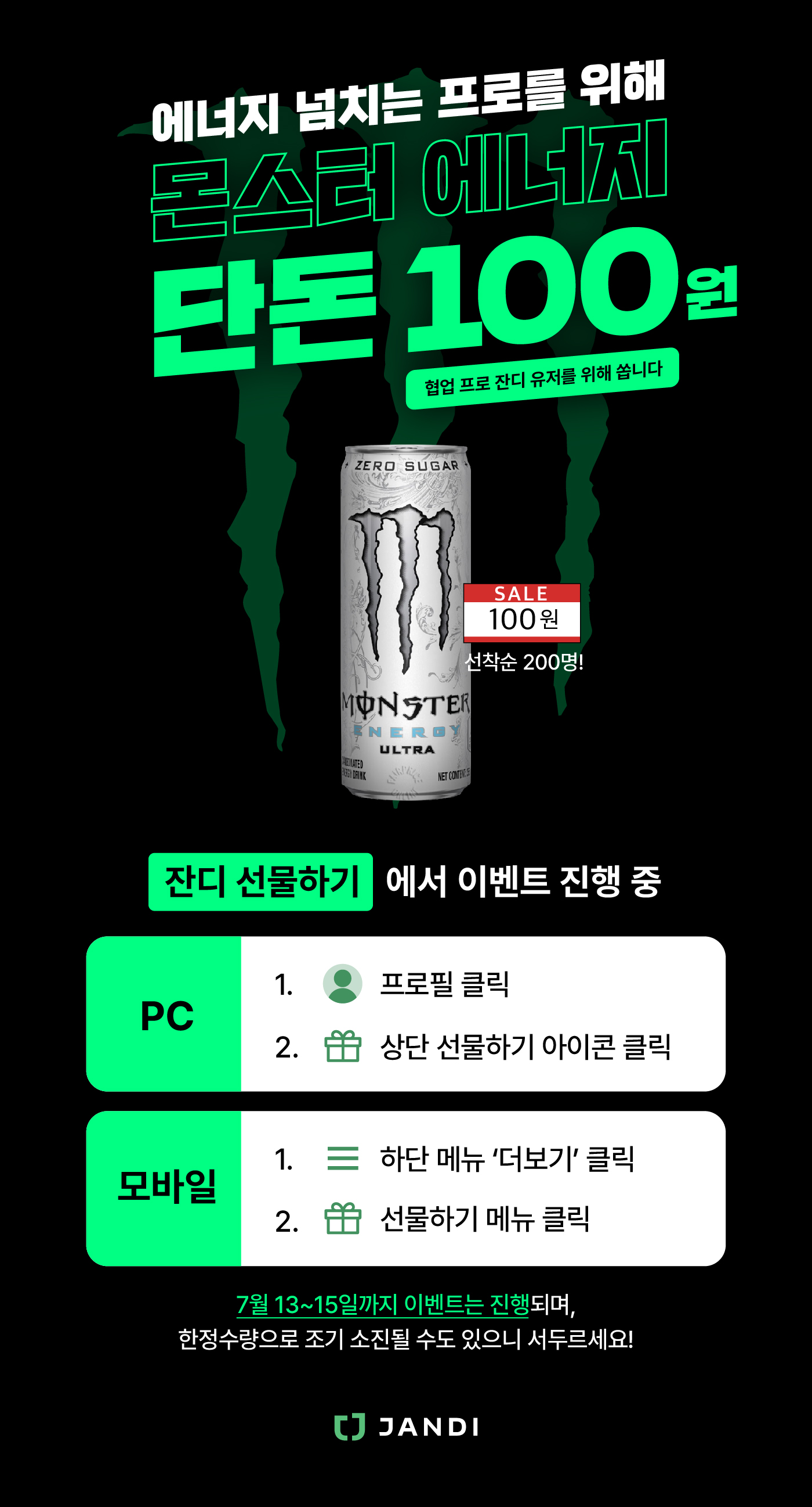장마로 인해 습하고 더웠던 지난 며칠간 많은 분들이 지쳤던 것 같습니다. 넘치는 에너지로 일하는 협업 프로에게도 파워업이 필요한 지금, 잔디 팀이 준비한 ‘몬스터 에너지 100원 이벤트’로 에너지 UP 하셔서 프로 of 프로가 되시길!