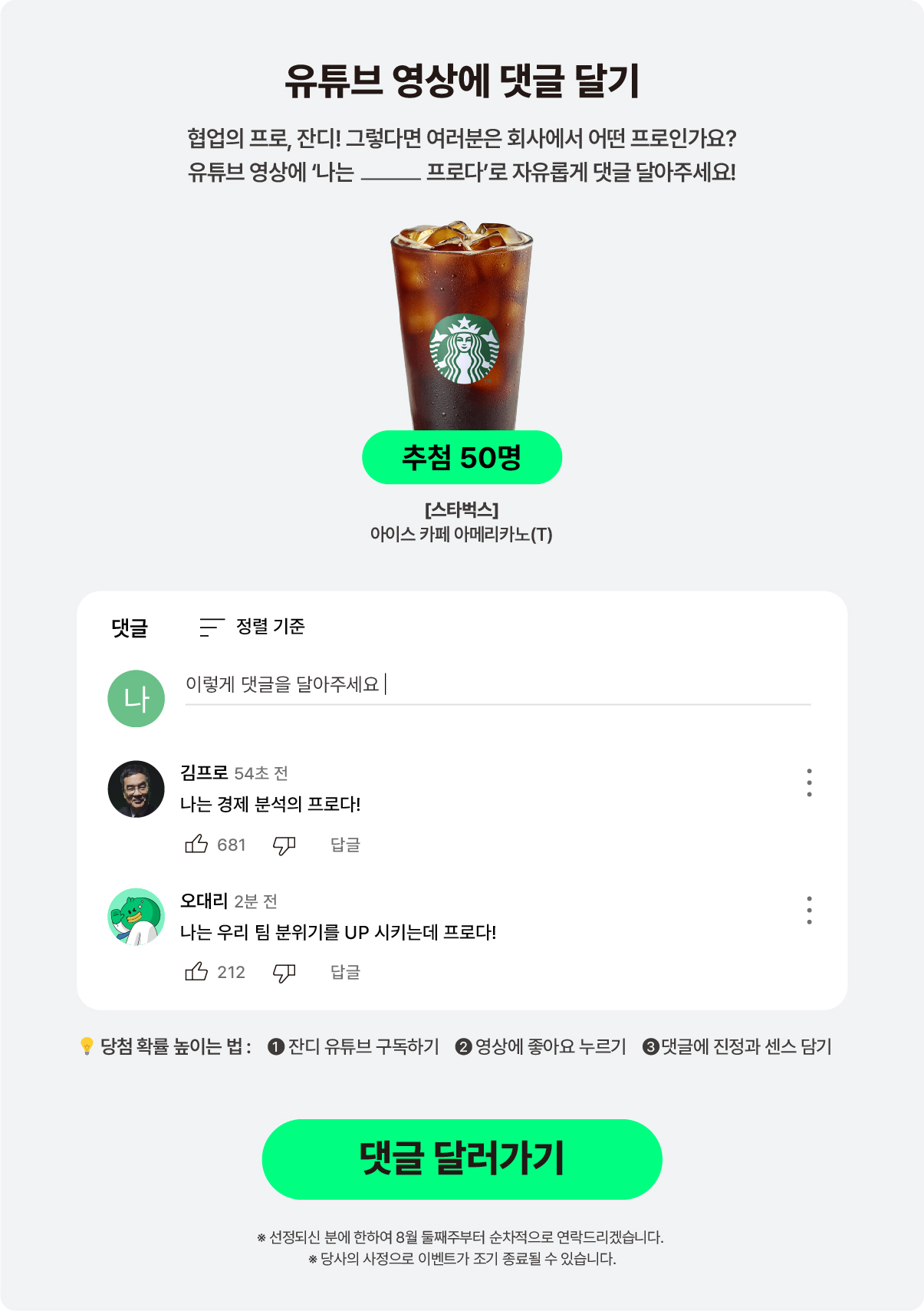 [이벤트] 삼프로TV 김프로와 함께 하는 댓글 이벤트 (종료) 게시일: 2022. 07. 13 Share 🕑 리딩타임: < 1 분 ✨2022. 7. 13 ~ 7. 31✨ 행복 가득한 7월이 되시길 바라며, 많은 관심과 응모 부탁드립니다🥰 포스트 뷰: 878 김동환김프로댓글이벤트삼프로유튜브이벤트 Share