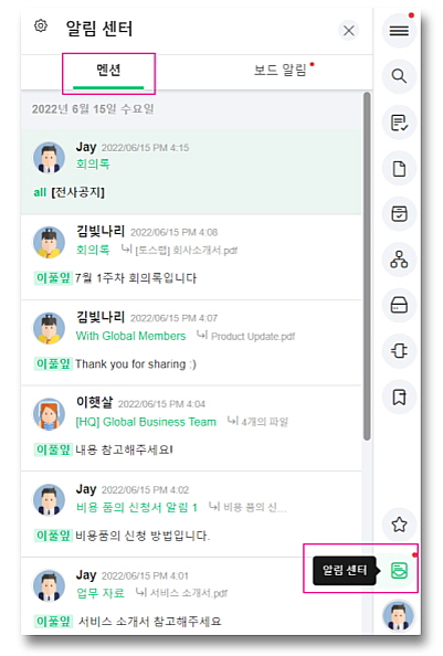- 방법 : 우측 하단 알림 센터 아이콘 클릭하면 내가 받은 멘션을 한눈에 모아볼 수 있습니다.