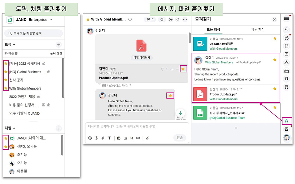 즐겨찾기 기능을 통해 이야기를 자주 나누는 토픽이나 채팅을 상단에 배치할 수 있고,