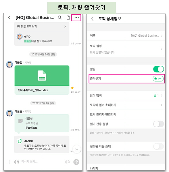 - 방법 : 토픽, 채팅은 우측 상단 더 보기[…] > 즐겨찾기 ON으로 변경해서 등록합니다.