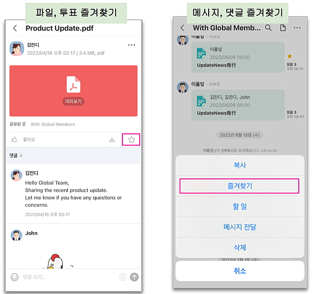 - 즐겨찾기로 등록된 아이템(메시지, 파일, 투표, 댓글)은 앱 우측 ☆(별표)에서 한눈에 확인할 수 있습니다.