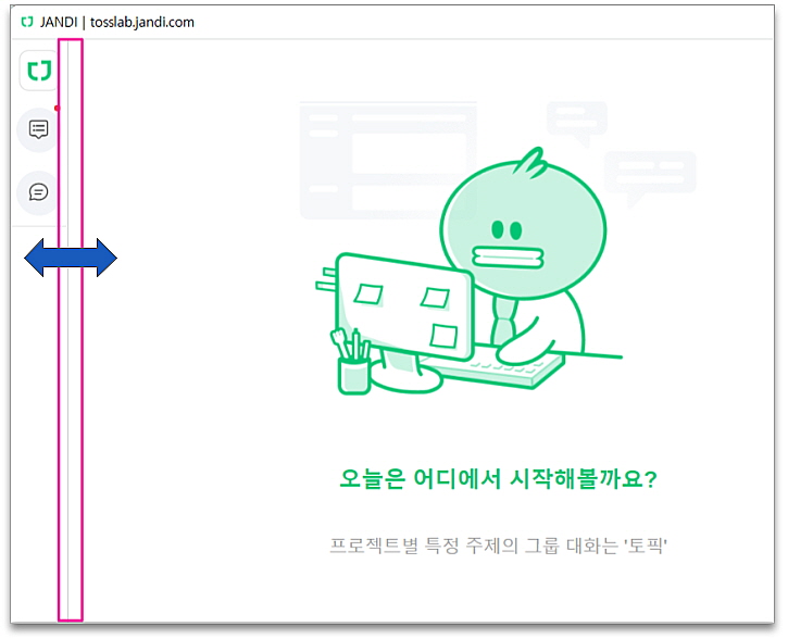 마우스(Drag&Drop)으로 잔디 PC 앱의 사이즈를 조절하는 것뿐만 아니라, PC 앱의 사이즈는 유지한 채 좌측 사이드바를 줄여서 대화창을 보다 넓게 사용할 수도 있습니다.