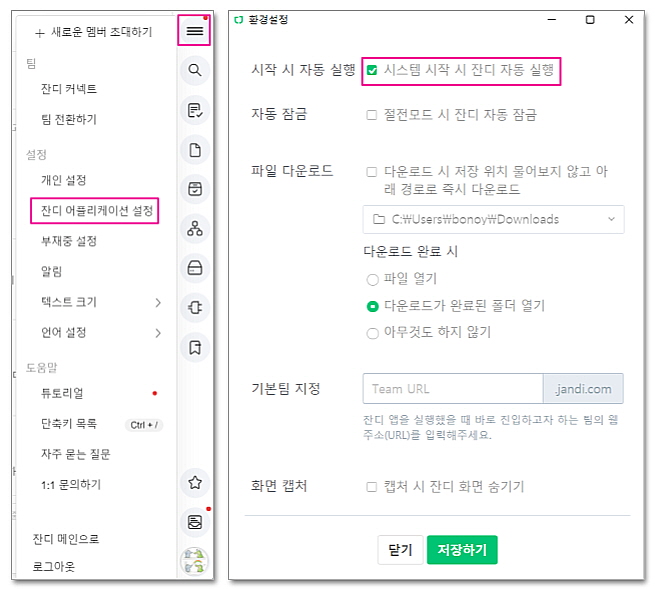 잔디 앱 우측 상단 [=] > [잔디 어플리케이션 설정] > [시작 시 자동 실행]을 체크해 주세요!