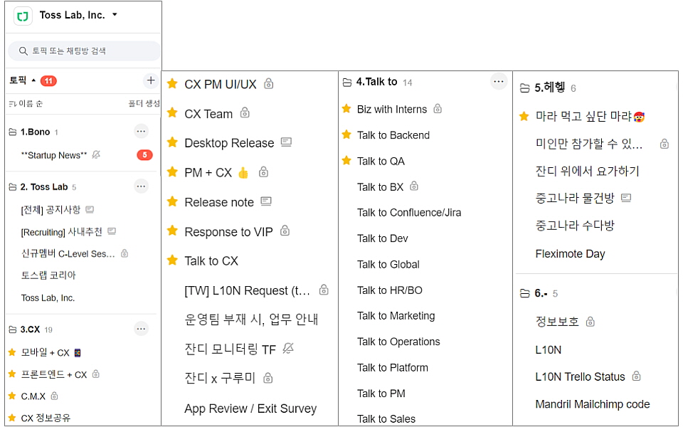 - 방법 : 토픽, 채팅은 이름 왼쪽에 ☆(별표)를 클릭해서 등록합니다.