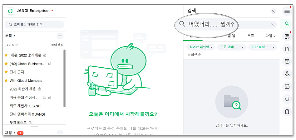 - 방법 : 단축키 Ctrl + J 을 클릭하거나, 잔디 앱 좌측 상단 검색을 클릭해 주세요!