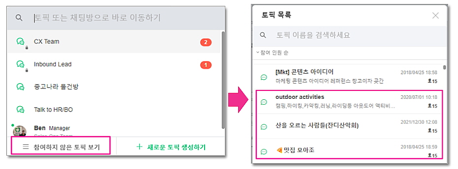 이 기능으로 팀 내 문화방(중고나라, 산악 모임 등)에 참석해서 사내 문화에 빨리 적응해보면 어떠실까요?