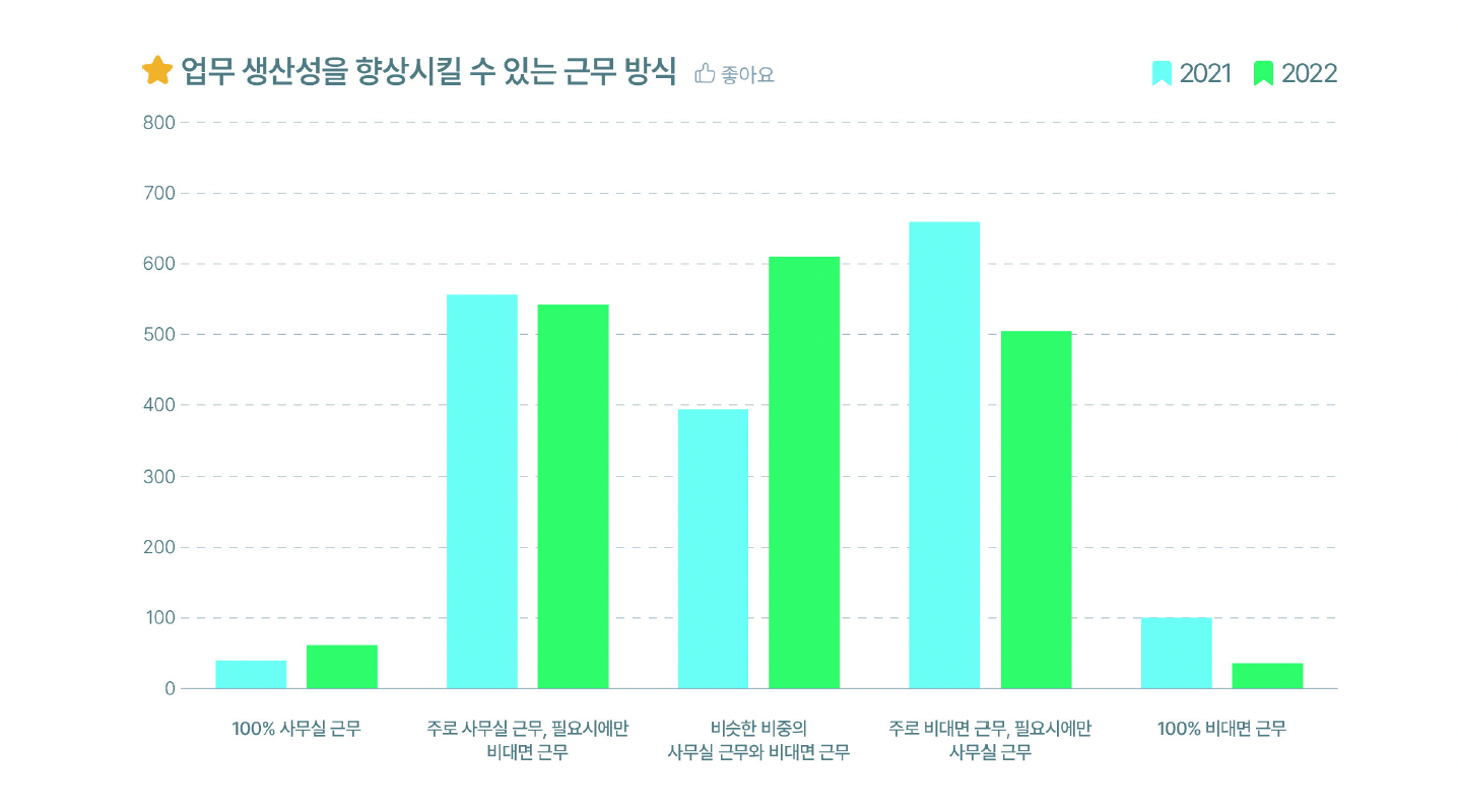 반드시 사무실에 출근해야 한다는 인식도 사라지고 있습니다. 업무용 협업툴 잔디가 2022년 발행한 보고서에 따르면 MZ세대 직장인의 약 95%가 업무 생산성을 향상시키는 근무 방식으로 사무실 근무와 재택근무를 병행하는 하이브리드 워크라고 답했습니다. 디지털 환경에서는 일과 일상의 명확한 구분이 필요하고, 물리적인 환경은 대면과 비대면을 혼합하는 방식이 변화의 흐름입니다. 일을 둘러싼 모든 환경이 근본적으로 변화하고 있어요. 변화를 인지하는 일은 이미 시작된 변화의 파도에 유연하게 대처하기 위한 시작입니다.
