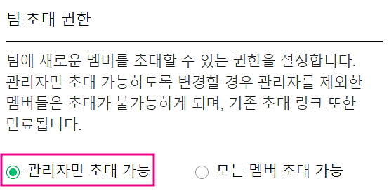 - 팀내 관리자 또는 소유자만 새로운 멤버 초대를 할 수 있도록 원한다면 [관리자만 초대 가능] 으로 설정 해주시면 됩니다.