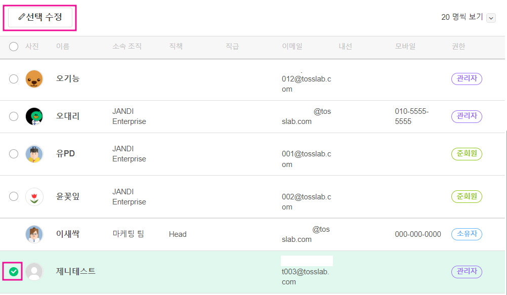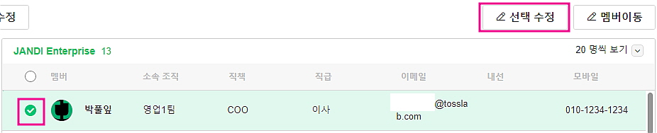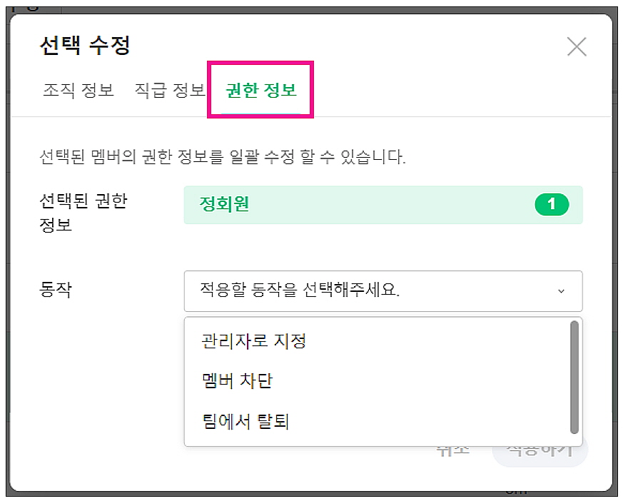 - 멤버 선택 > [선택 수정] > [조직 정보], [직급 정보], [권한 정보]를 변경할 수 있습니다.