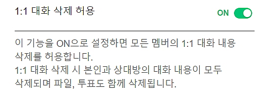 - [1:1 대화 삭제 허용] 을 On을 한다면 1:1 대화방 삭제할 수 있는 기능을 이용하실 수 있습니다.