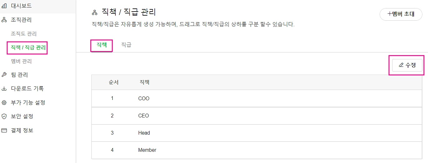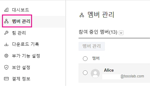 - 팀에서 [조직관리] 기능을 Off로 했을 경우 멤버들의 권한을 설정할 수 있는 [멤버 관리] 탭으로도 이용 가능합니다.