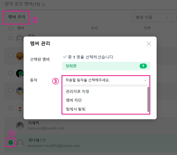 멤버를 선택 > [멤버 관리] > 권한 정보를 변경할 수 있습니다.